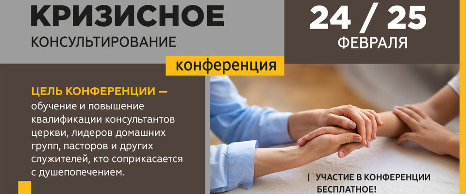 Мероприятие пройдёт в третий раз 24 и 25 февраля в московской церкви «Благая весть» в третий раз состоится конференция по кризисному консультированию. Она направлена на обучение и повышение квалификации консультантов церкви, лидеров домашних групп, пасторов и других служителей, чья деятельность связана с душепопечением. Спикерами выступают профессиональные христианские психологи и душепопечители. В этом году будут обсуждаться … Московская церковь «Благая весть» проведёт конференцию по кризисному консультированию