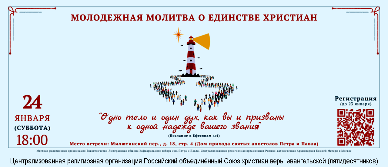 24 января 2026 года представители церквей РОСХВЕ(п) приняли участие в Молодёжной молитве о единстве христиан, состоявшейся в Москве, в Доме прихода святых апостолов Петра и Павла*. Встреча собрала молодых представителей христианских конфессий и состоялась в рамках международной Недели молитв о единстве христиан. Тема мероприятия этого года была основана на словах апостола Павла из Послания к … Представители РОСХВЕ(п) приняли участие в Молодёжной молитве о единстве христиан