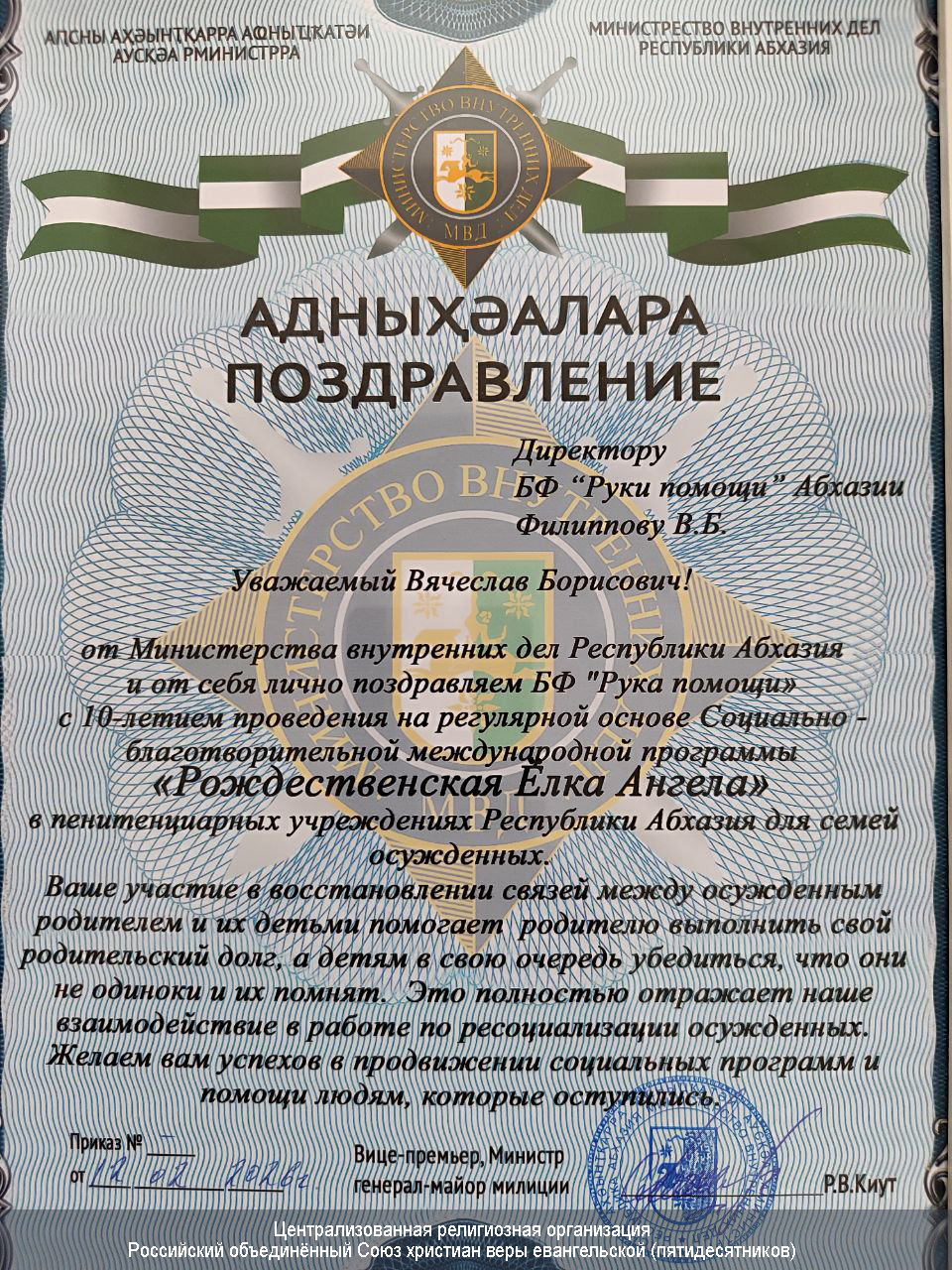 19 февраля 2026 года вице-премьер, министр внутренних дел Абхазии Роберт Киут наградил благодарностью директора Благотворительного фонда «Рука помощи» Вячеслава Филиппова. Торжественная встреча состоялась в МВД республики и была приурочена к 10-летию сотрудничества.