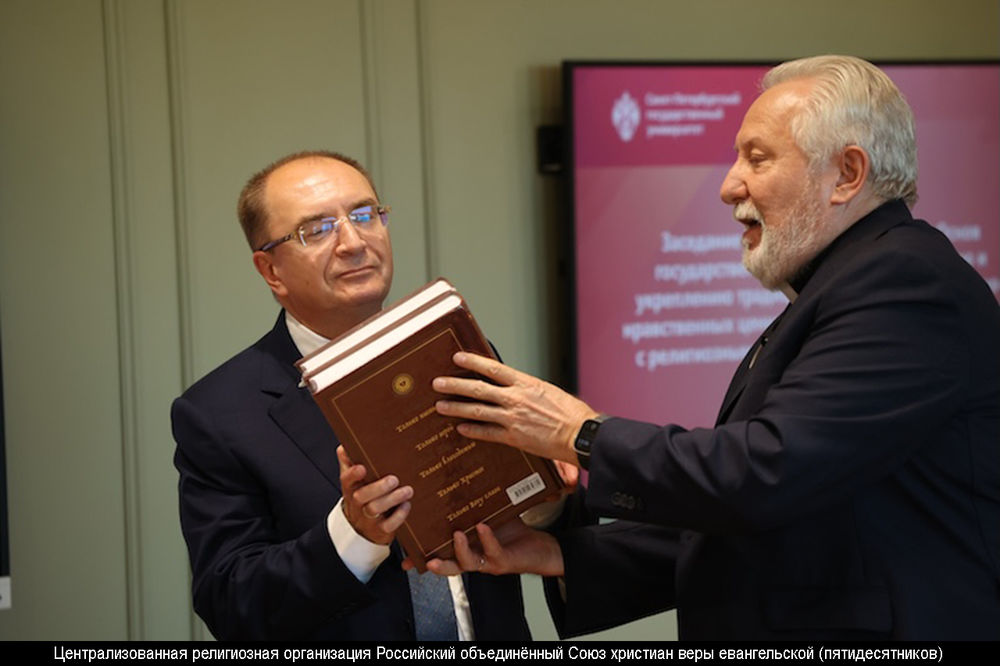 Также Начальствующий епископ торжественно вручил ректору СПбГУ Николаю Кропачеву фундаментальный научный труд — недавно изданную Энциклопедию протестантизма, которая подробно освещает историю и роль протестантской конфессии в России.