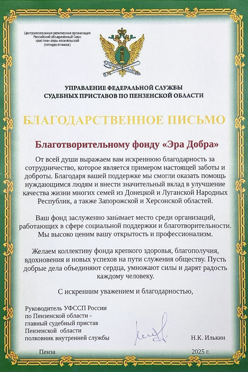 Главная / Инфопортал / Новости / Фонд «Эра добра» получил благодарственное письмо от Управления ФССП по Пензенской области