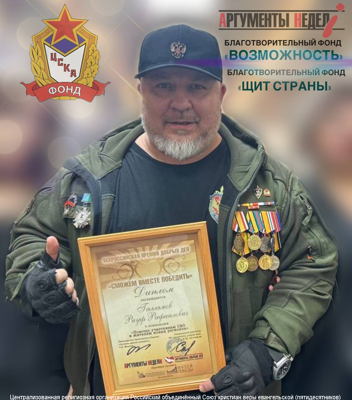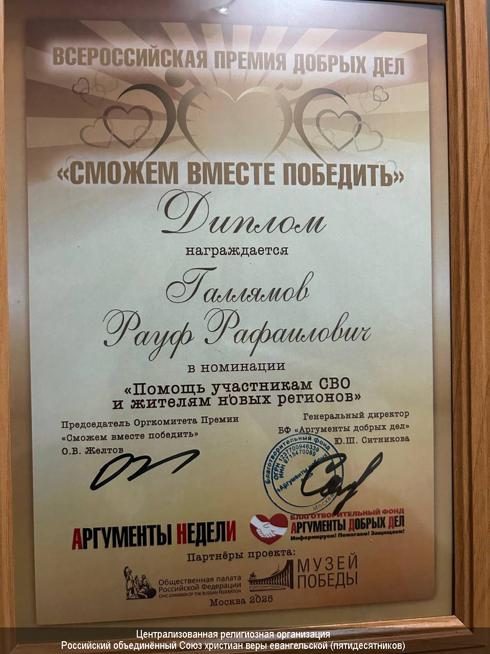 4 декабря 2025 года в Москве пастор церкви «Благая весть» г. Москва* Рауф Галлямов стал лауреатом Всероссийской премии «Сможем вместе победить». Торжественная церемония награждения состоялась в Музее Победы на Поклонной горе.