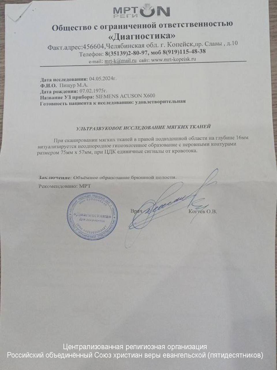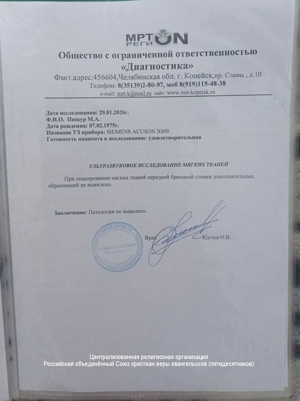 — Через несколько дней после молитвы я пошла на контрольное УЗИ. Тот же врач, который в мае во время УЗИ был шокирован увиденным, на этот раз говорит: «Марина, у Вас всё замечательно! Ничего нет. Это лучший снимок, который я сегодня видел». В заключении написали: «Патологии не обнаружено». А до этого было объёмное образование брюшной полости.