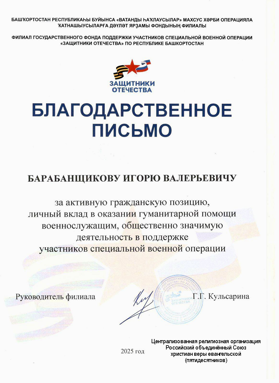 Исполнительный директор АНО «Новая Жизнь», служитель Христианского центра «Завет» Игорь Барабанщиков был отмечен благодарственным письмом от руководителя филиала Государственного фонда поддержки участников специальной военной операции «Защитники Отечества» по Республике Башкортостан Гульнур Кульсариной за активную гражданскую позицию, личный вклад в оказание гуманитарной помощи военнослужащим, общественно значимую деятельность в поддержке участников специальной военной операции.