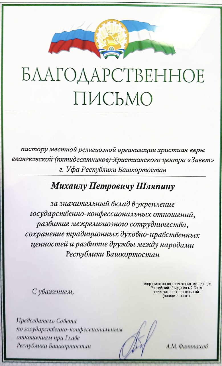 Пастор Христианского центра «Завет» Михаил Шляпин получил благодарственное письмо от председателя Совета по государственно-конфессиональным отношениям при Главе Республики Башкортостан Азата Фаттахова за значительный вклад в укрепление государственно-конфессиональных отношений, развитие межрелигиозного сотрудничества, сохранение традиционных духовно-нравственных ценностей и развитие дружбы между народами в Республике Башкортостан.