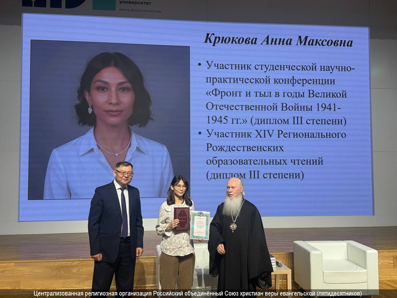 Обладателями награды стали шесть учащихся, отличившихся в учебе, научной работе и общественной деятельности. В их числе — прихожанки евангельских церквей города: Анна Крюкова (церковь «Новый Завет» г. Улан-Удэ**) и Светлана Ардаева (церковь «Любовь Отца» г. Улан-Удэ***).