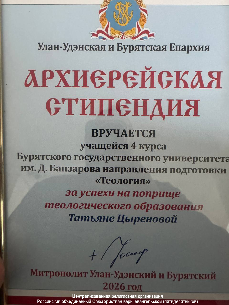 12 марта 2026 года в Улан-Удэ в Бурятском государственном университете* представители евангельских церквей — студенты направления «Теология» — получили Архиерейские стипендии.