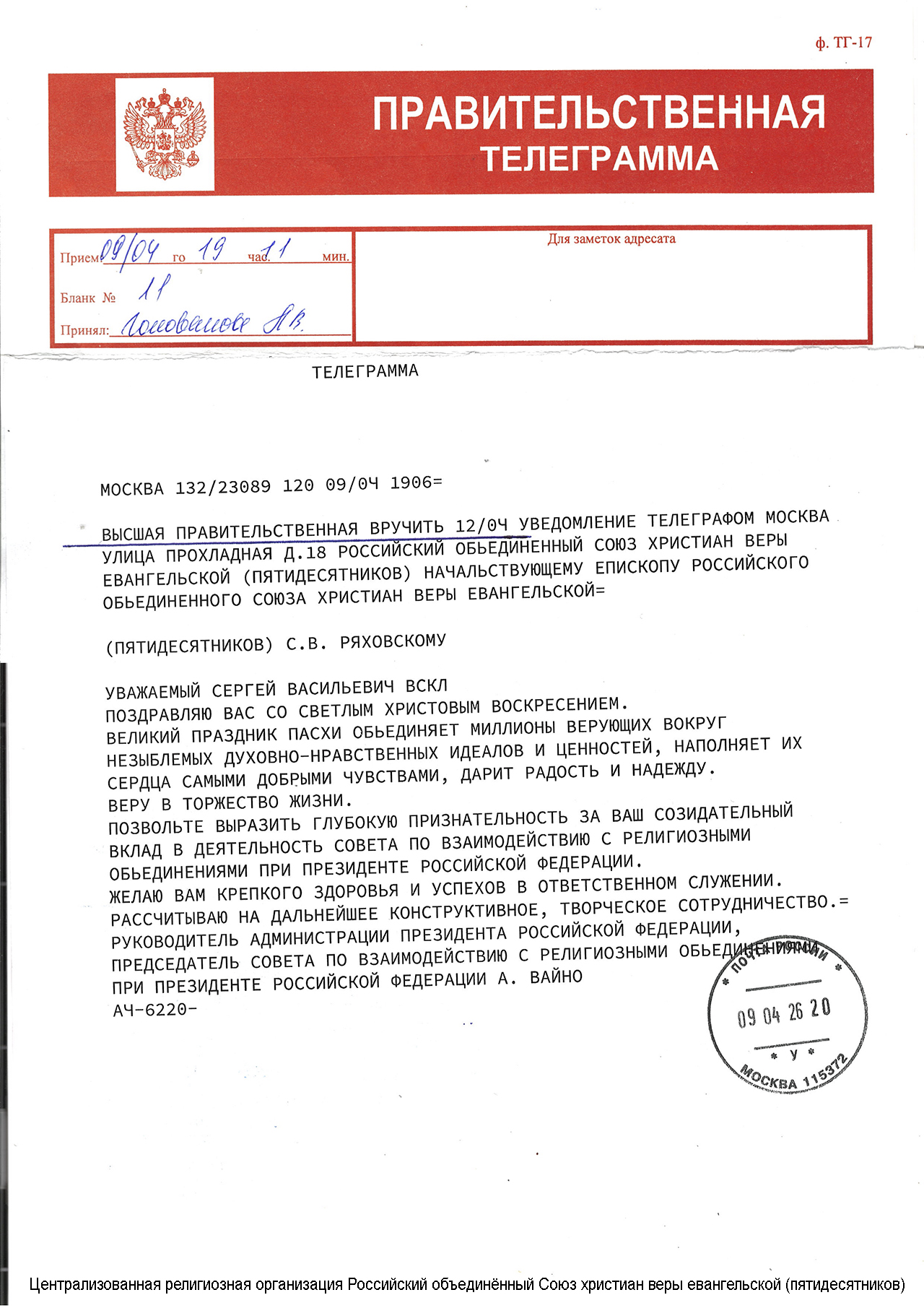 Главная / Инфопортал / Поздравления / А.Э. Вайно поздравил епископа С.В. Ряховского с Пасхой
