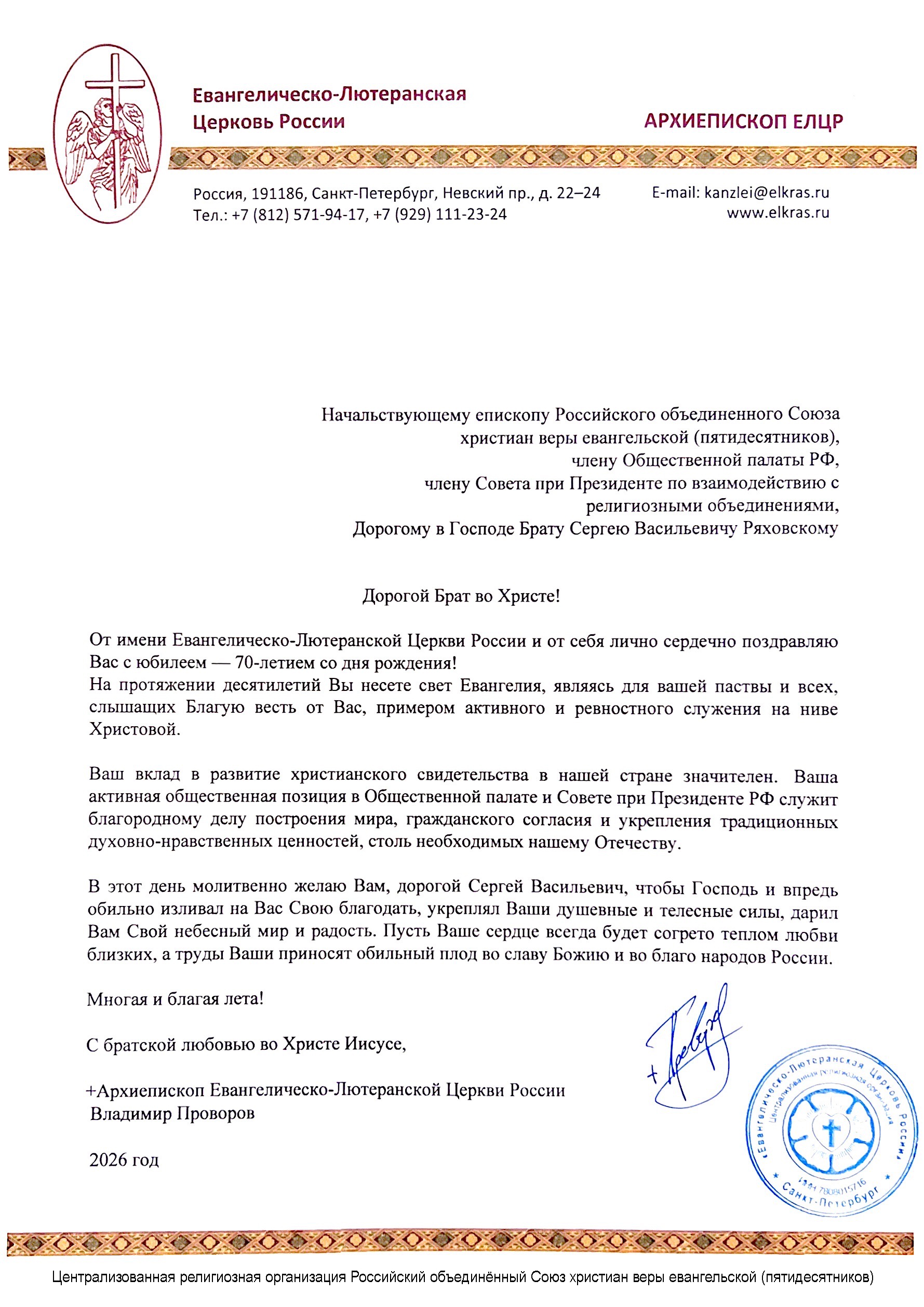 Архиепископ Евангелическо-Лютеранской Церкви России В. Проворов поздравил епископа С.В. Ряховского с 70-летием
