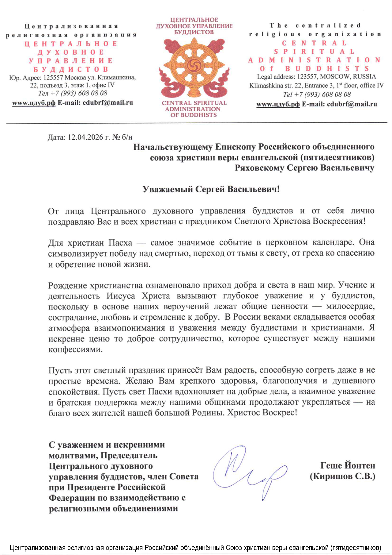 Главная / Инфопортал / Поздравления / Геше Йонтен (Киришов С.В.) поздравил епископа С.В. Ряховского с Пасхой