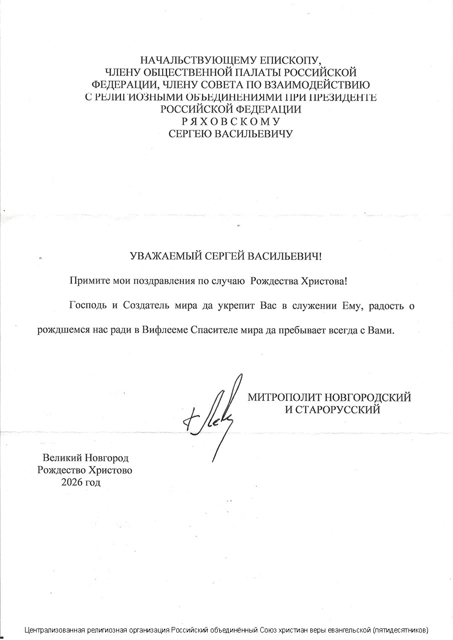 Главная / Инфопортал / Поздравления / Митрополит Новгородский и Старорусский Лев поздравил епископа С.В. Ряховского с Рождеством Христовым