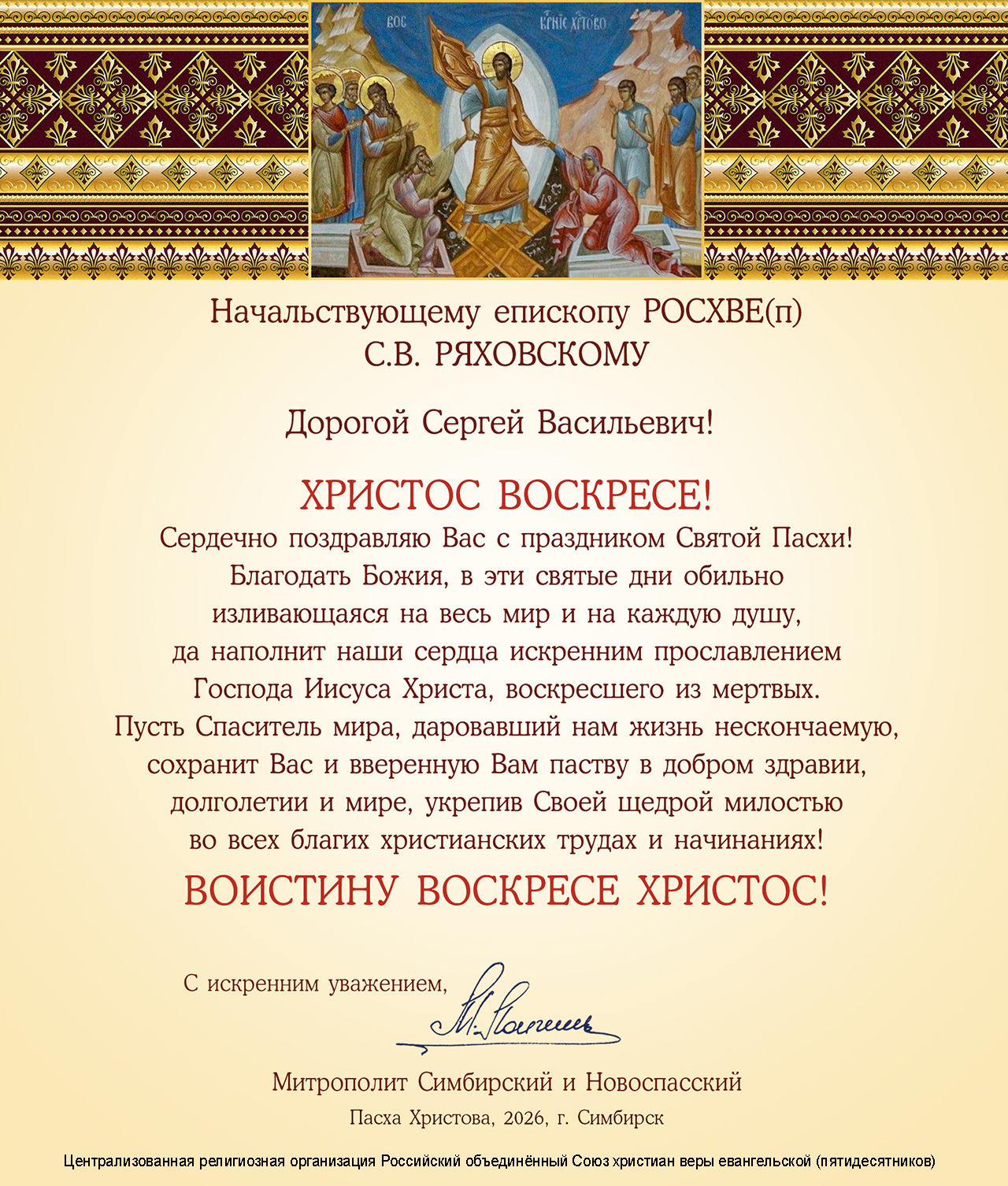Главная / Инфопортал / Поздравления / Митрополит Симбирский и Новоспасский Лонгин поздравил епископа С.В. Ряховского с Пасхой