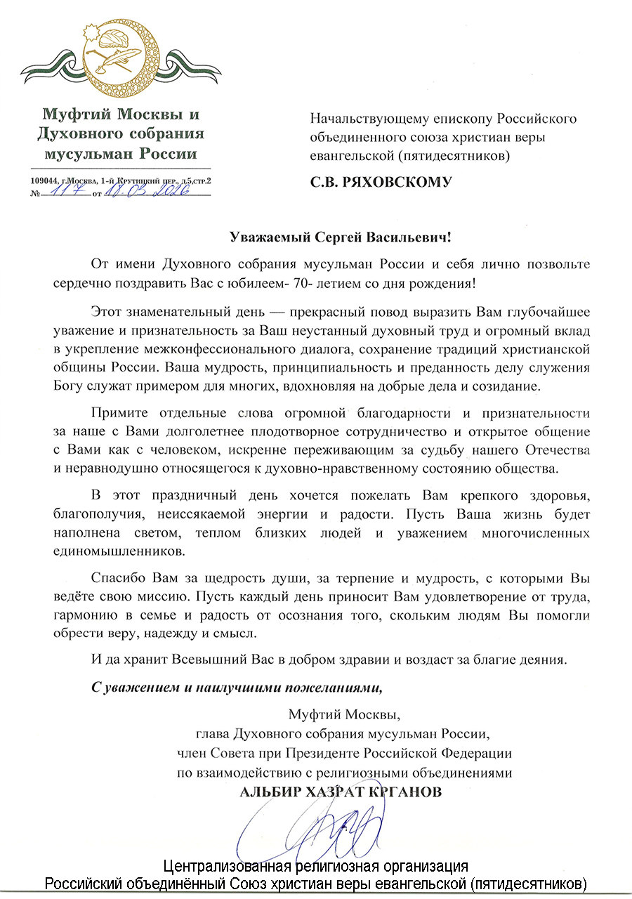 Главная / Инфопортал / Поздравления / Муфтий Альбир Крганов поздравил епископа Сергея Ряховского с днём рождения