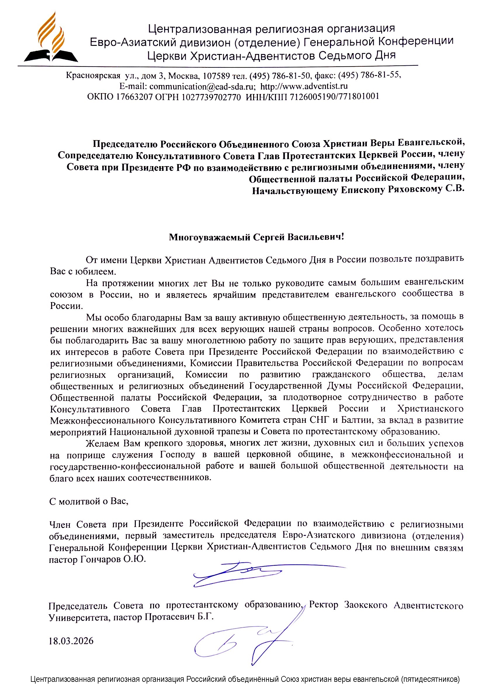 Поздравление епископу С.В. Ряховскому с 70-летием от имени Церкви Христиан Адвентистов Седьмого Дня в России