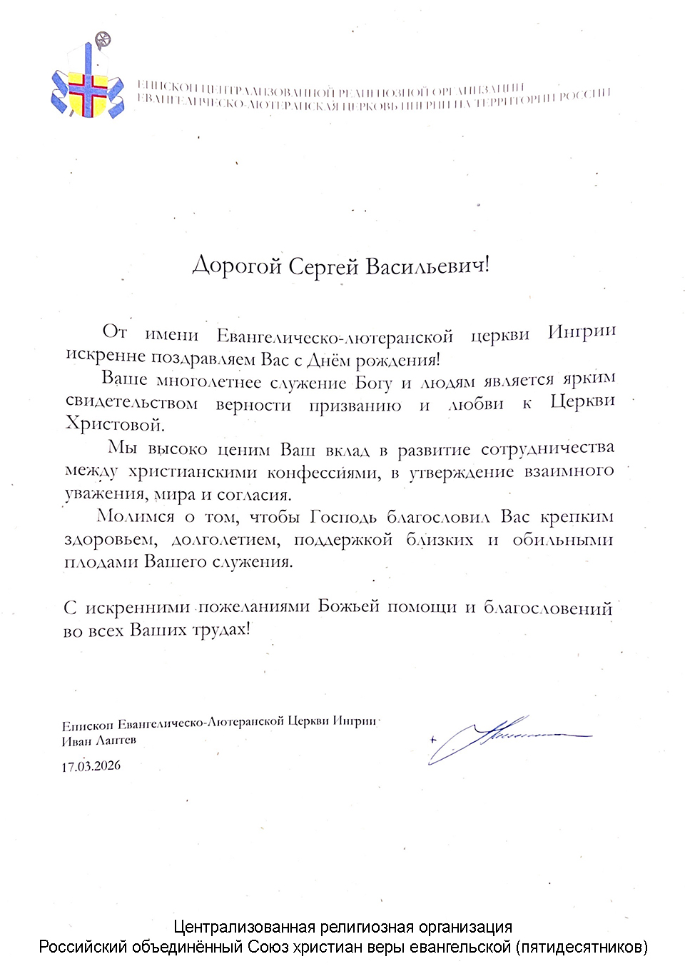 Поздравление с 70-летием епископу С.В. Ряховскому от имени Евангелическо-лютеранской церкви Ингрии