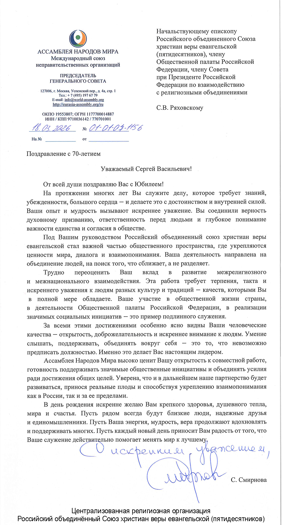 Поздравление с 70-летием С.В. Ряховскому от Председателя Генерального совета Ассамблеи Народов Мира С.К. Смирновой
