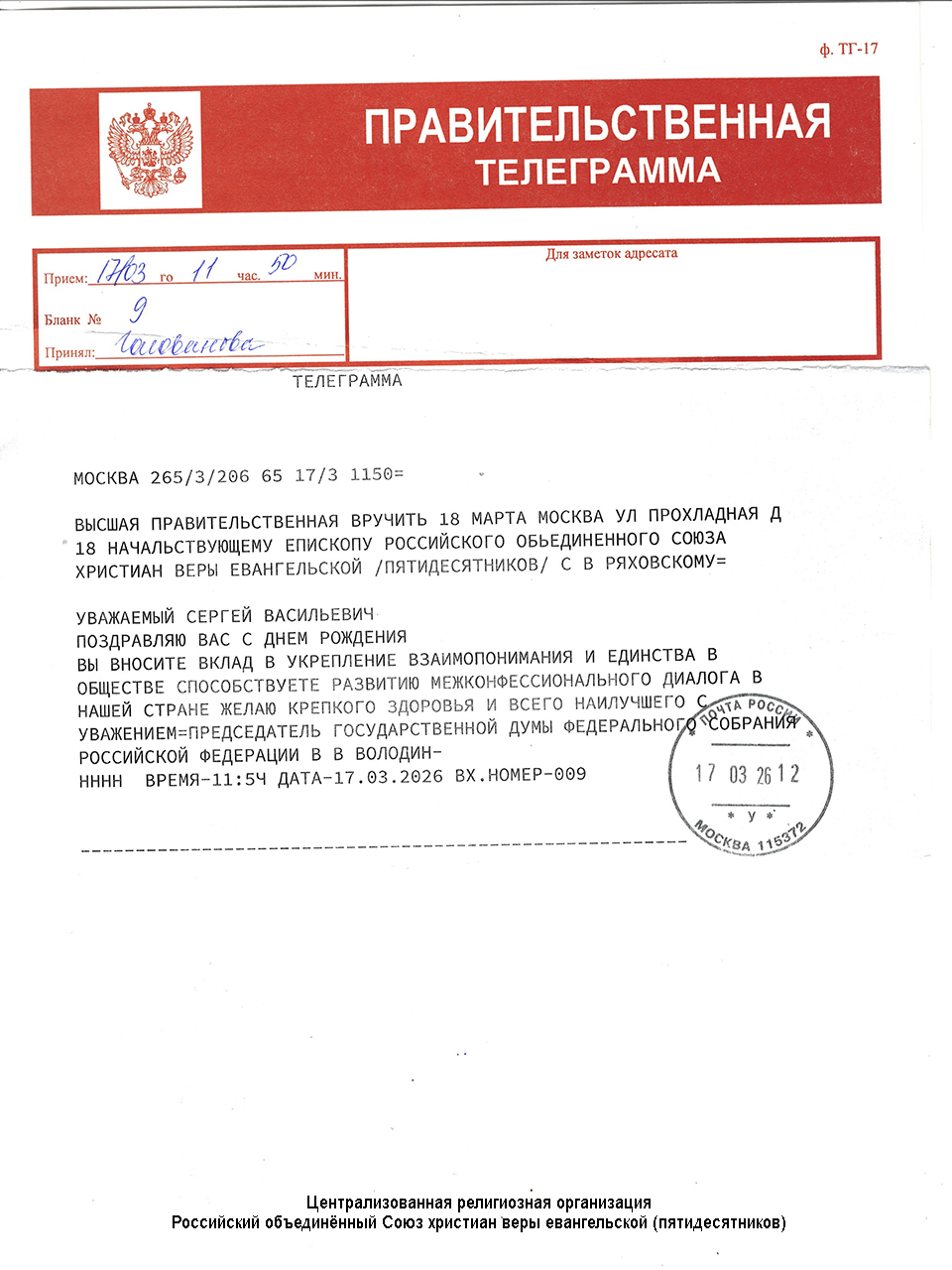 Централизованная религиозная организация Российский объединенный Союз христиан веры евангельской (пятидесятников)