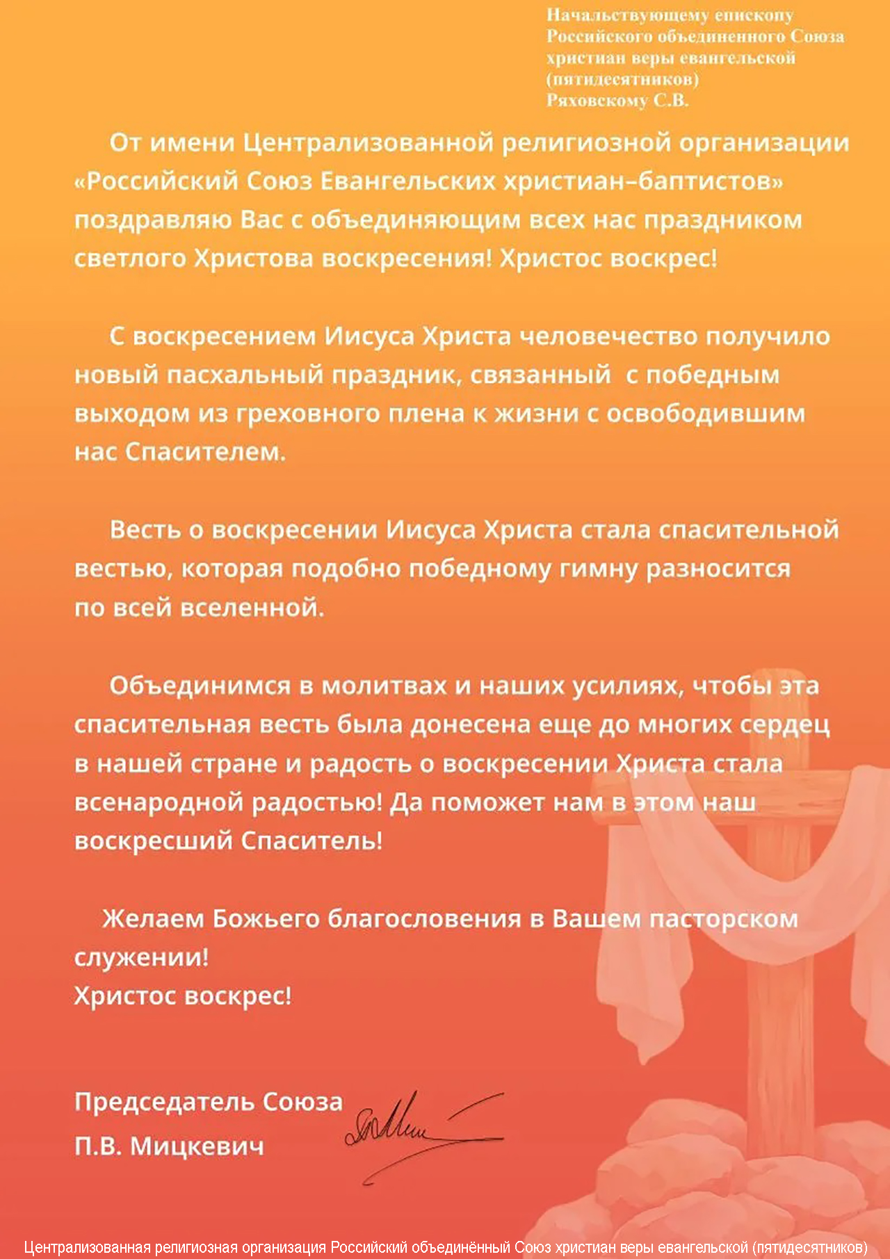 Главная / Инфопортал / Поздравления / Председатель Союза РС ЕХБ П.В. Мицкевич поздравила епископа С.В. Ряховского с Пасхой