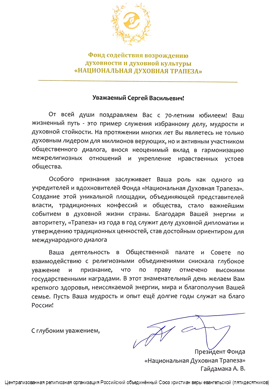 Президент фонда «Национальная Духовная Трапеза» А.В. Гайдамака поздравил епископа С.В. Ряховского с 70-летием