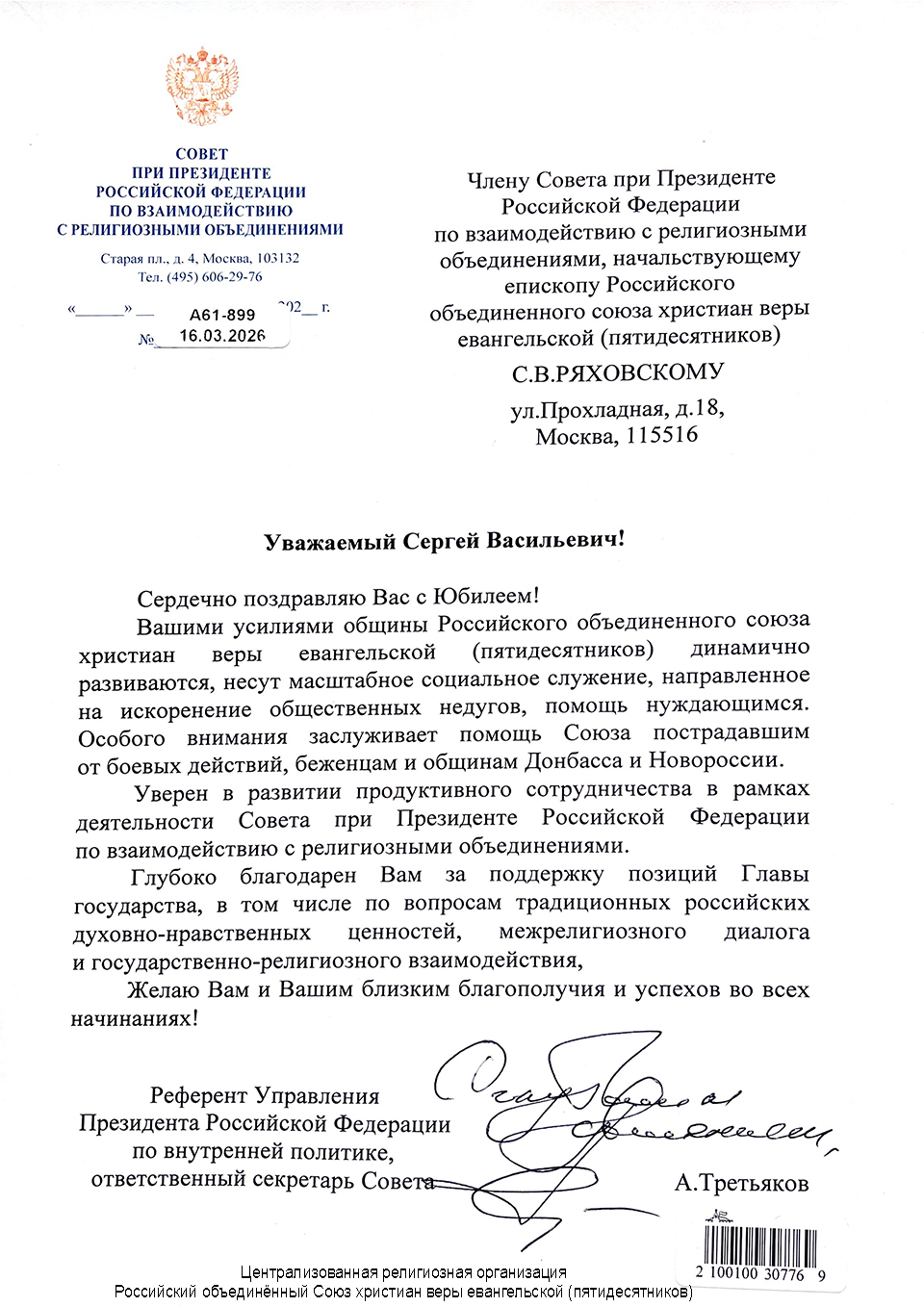 Главная / Инфопортал / Поздравления / Референт Управления Президента РФ по внутренней политике А.В. Третьяков поздравил епископа С.В. Ряховского с юбилеем