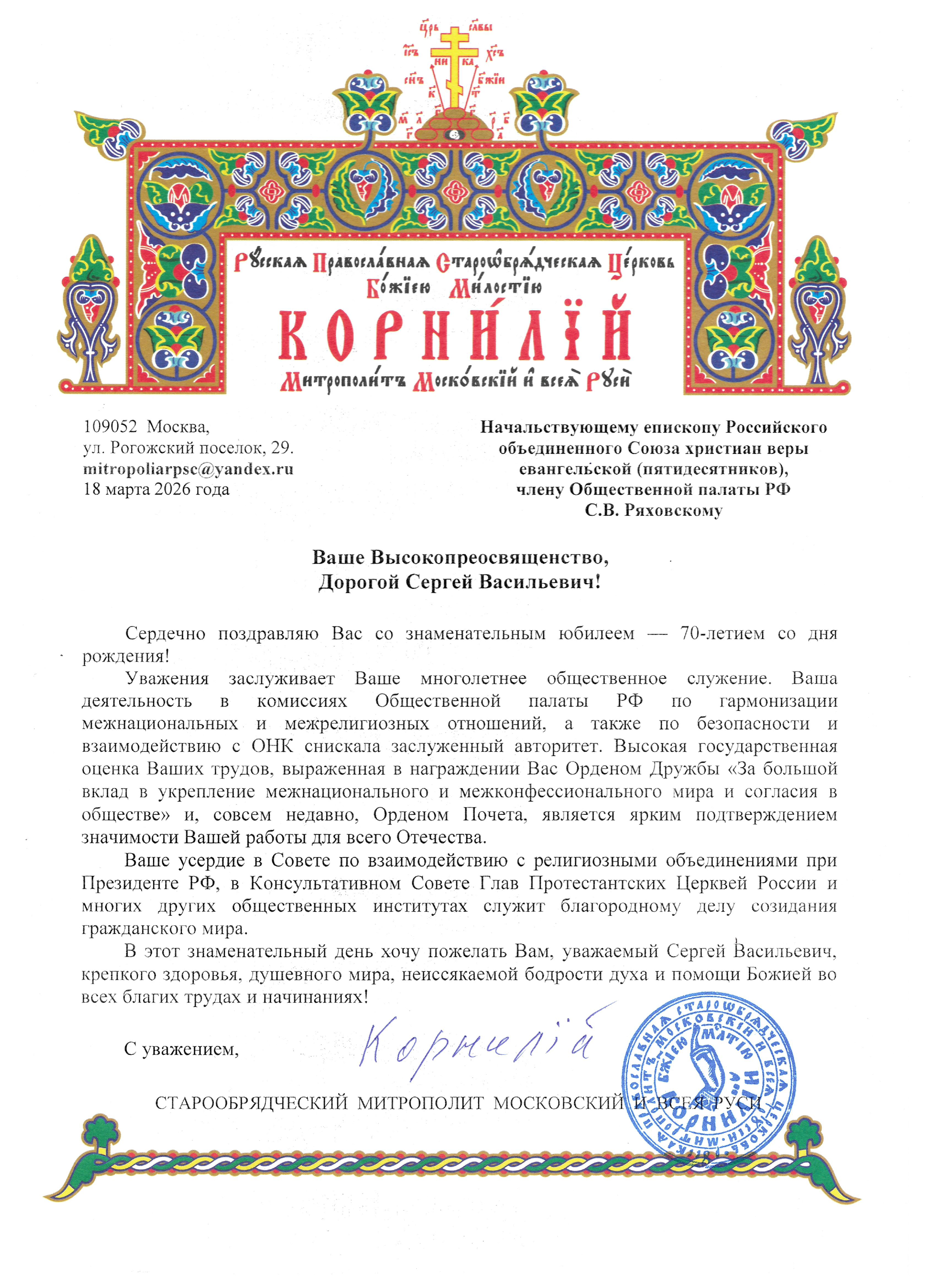 Главная / Инфопортал / Поздравления / Старообрядческий митрополит Корнилий поздравил епископа Сергея Ряховского с днём рождения
