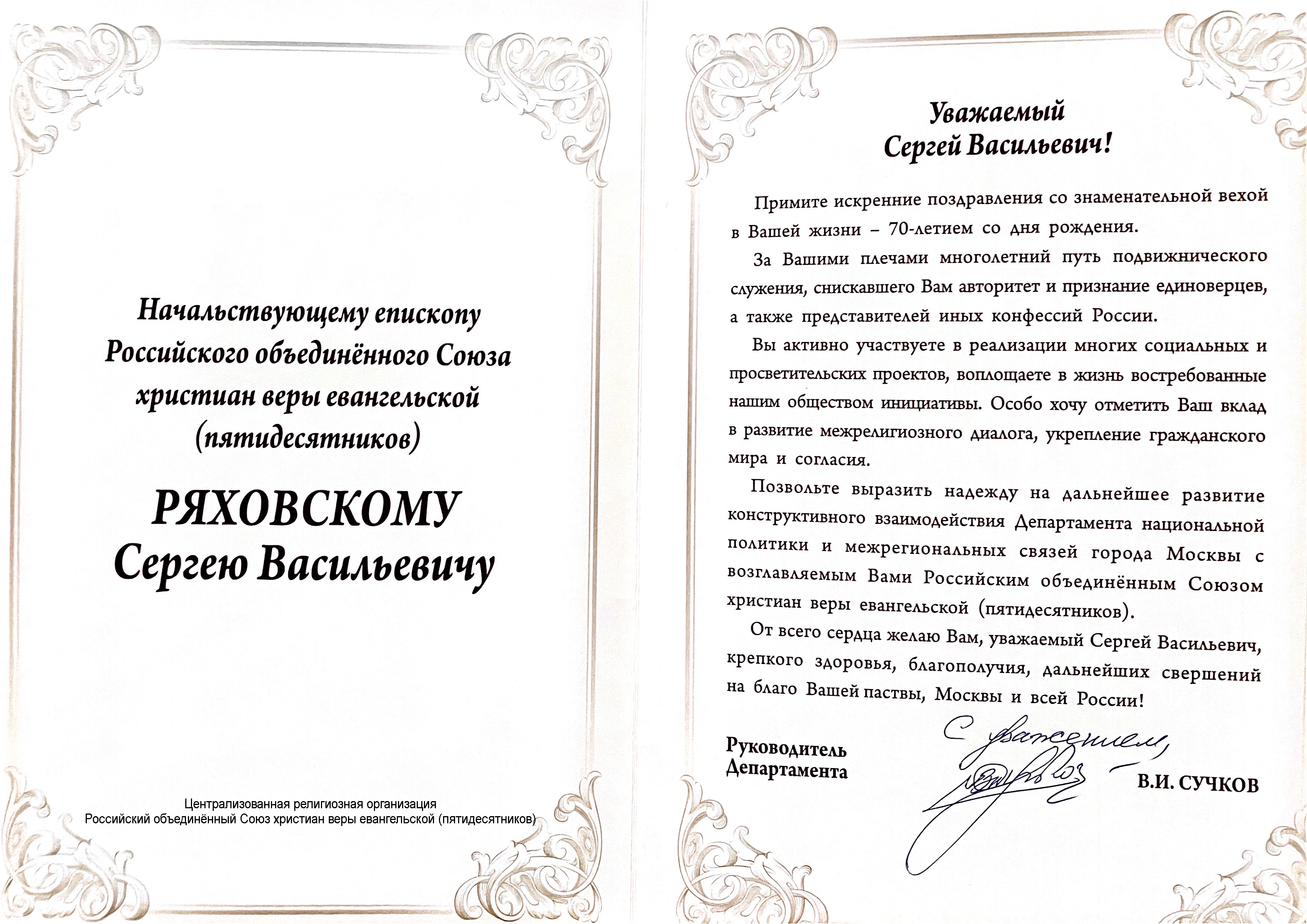 Главная / Инфопортал / Поздравления / В.И. Сучков поздравил епископа С.В. Ряховского с 70-летием